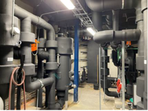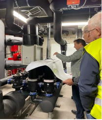 Vervolgens bezochten we de techniekruimte van het buurtwarmtesysteem, een ruimte van 10 x 10 meter, in het oude Philipsgebouw. Hier werd het water gefilterd en bewerkt voor gebruik in de warmtewisselaars, waarvoor een indrukwekkende hoeveelheid buizen en (meet)apparatuur stond opgesteld.
